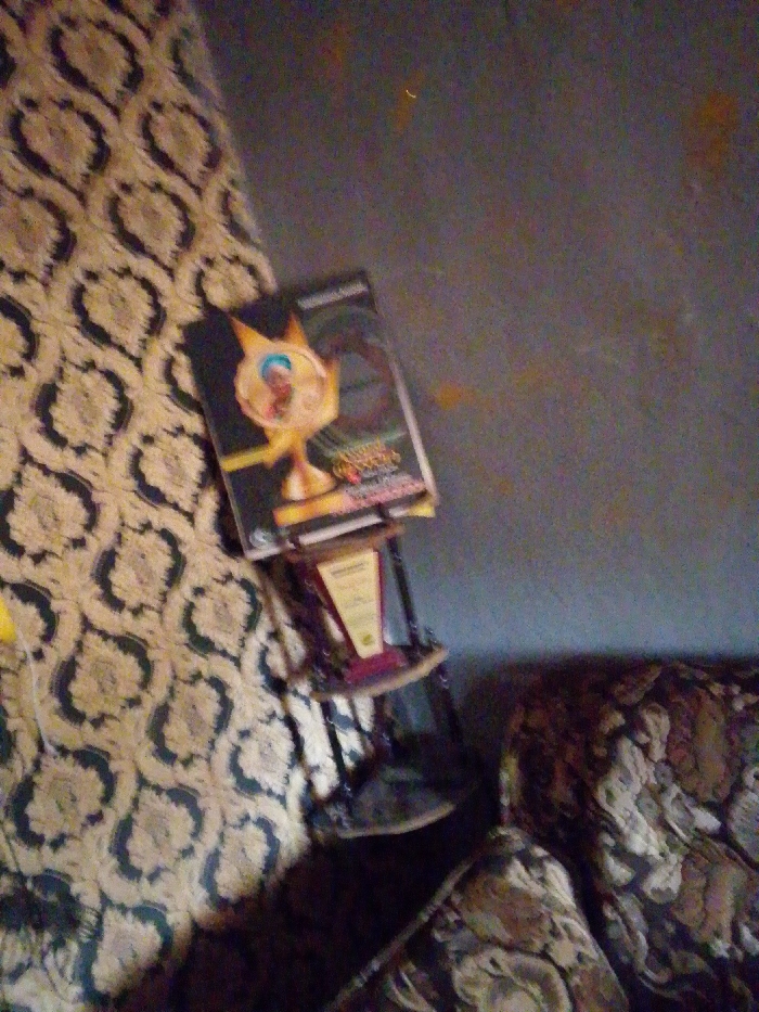 An interior scene, identified as being in Ankpa, Nigeria, is depicted from an elevated, oblique perspective. The left side of the frame is dominated by a light-colored fabric featuring a repetitive pattern of dark, stylized, heart-like motifs. In the central area, a stack of objects rests against a dark grey wall, which exhibits multiple yellowish-orange discolored patches. The topmost object in the stack is a book or media case, dark in color, featuring a prominent golden trophy design with a central image of a person's head wearing a blue head covering. Text, including "SUPERIOR" and "GOLDEN," is visible below the trophy design. Directly beneath this item is a dark, rectangular object, likely another book or case. Below these, a dark, multi-tiered stand or small shelf unit is visible, upon which a light-colored certificate or plaque with legible text is displayed. The lower right quadrant of the image shows a second patterned fabric, distinct from the left-side fabric, exhibiting an abstract, swirling design in muted tones of brown, beige, and dark green or black. No individuals are present within the scene, and no actions or interactions are depicted. The overall lighting is subdued, resulting in a grainy image quality.