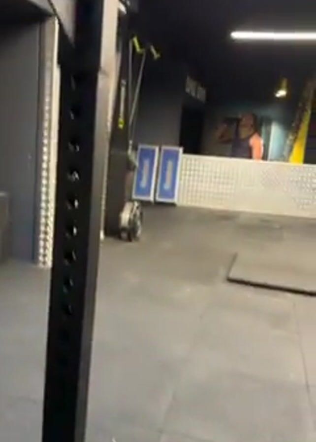inside of a gym. A black metal weightlifting rack is visible on the left side of the frame. The floor is covered in square black rubber mats. In the background, exercise equipment, including a stair climber and racks with weights, can be seen. The gym has a high ceiling with rectangular windows along the top. The walls are painted black and there are horizontal lights on the ceiling. A hand covered with white chalk is in the foreground.