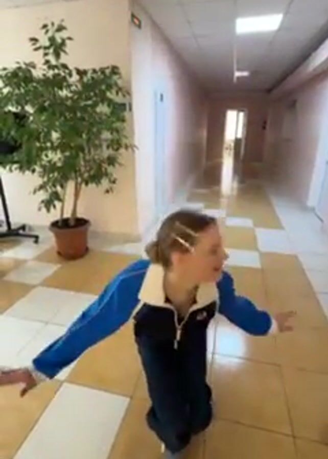 A young woman is jumping in a hallway. She is wearing a black and blue jacket, dark jeans, and gray slip-on shoes. The hallway has a checkered floor with cream and light brown squares. The walls are light pink. There's a potted plant in the left corner of the frame. The woman appears to be dancing.