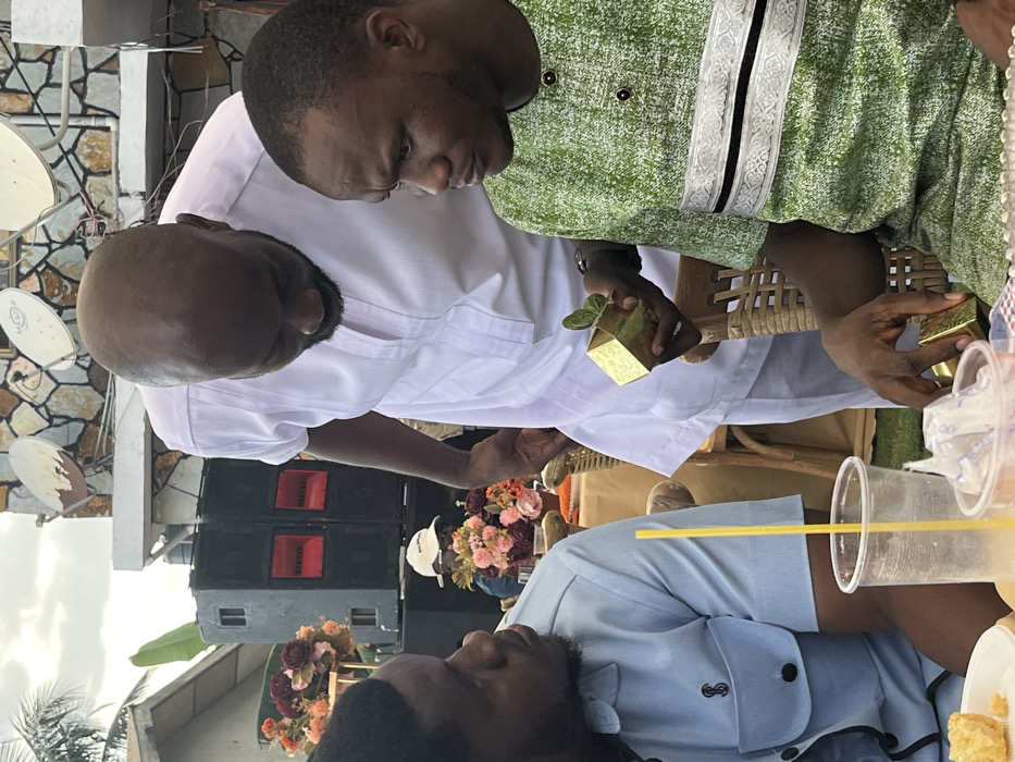 The scene, located in Kumasi, Ghana, depicts an outdoor social gathering under an overcast sky. Three adult males are visible in the foreground. A bald man with a dark beard, wearing a white traditional tunic, stands slightly bent over, holding a small gold-colored cubic pot containing a succulent plant in his left hand. He is looking down at the object or towards the seated man in front of him. This second man, with short dark hair and stubble, wears a green patterned tunic with a horizontal white and black decorative band. He is seated in a wicker chair, looking towards the standing man, with his right hand resting near another identical gold-colored cubic pot on the table beside him. To the left, a third man with dark hair, wearing a light blue short-sleeved button-up shirt with a black embroidered logo, is seated and looking towards the man in green. The environment includes a round table covered with an orange cloth, adorned with floral arrangements featuring pink, orange, and maroon flowers. Plastic cups, one with a yellow straw, are on the table alongside a small food item on a white plate. In the background, large black audio speakers with red accents are stacked on a platform. Behind them, a building wall with a stone veneer finish is visible, featuring multiple rusted satellite dishes. The ground beneath the seating area is covered with artificial green turf. A banana plant leaf is partially visible in the far left background. A person wearing a white cap is partially visible behind the table's floral arrangement.