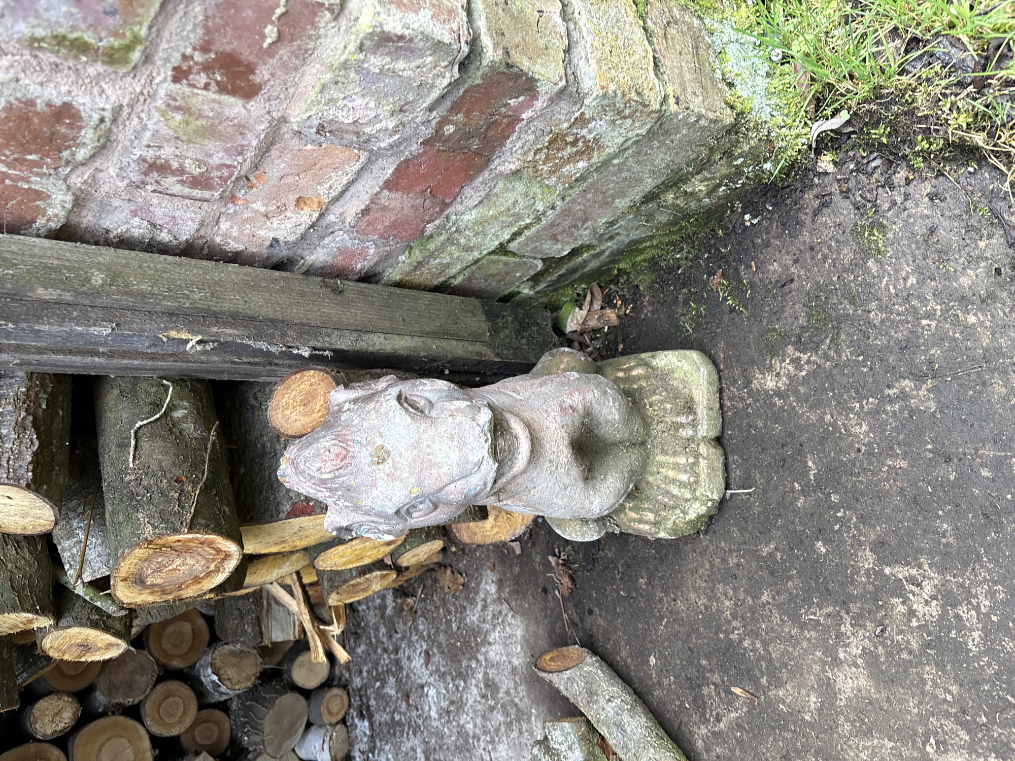 gray stone sculpture of a crouching figure next to a brick wall in an outdoor setting, located in Pulverbatch, United Kingdom. The brick wall is partially covered in moss and lichen. Adjacent to the sculpture is a stack of cut firewood. The ground is concrete or paved and appears damp. There is some sparse green vegetation in the top right corner of the image. The photograph has been taken from a high angle.