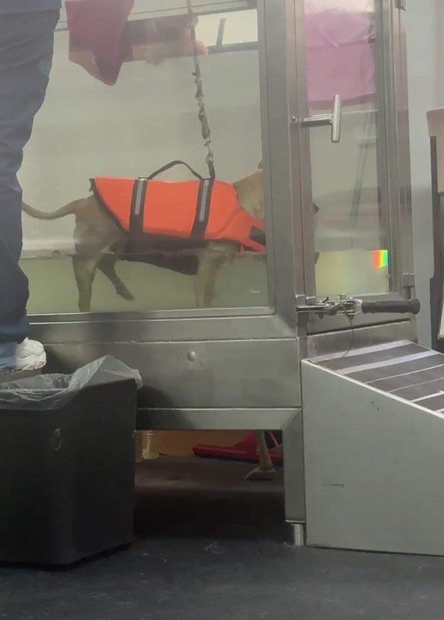 - "A medium-sized dog wearing an orange life vest is in a glass-walled underwater treadmill" by FM-nKu5C3, licensed under CC BY 4.0