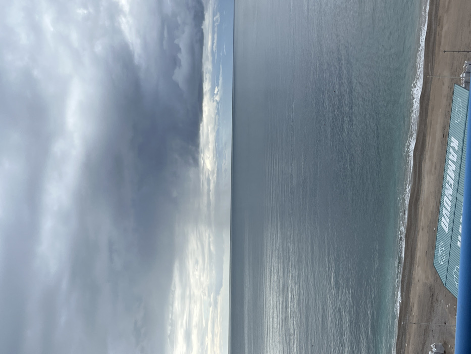 The image displays an elevated view of Kamenovo Beach, Montenegro, under an overcast sky. The upper half of the frame is dominated by heavy, dark gray clouds with lighter gray patches towards the horizon. A visible column of rain is falling from the clouds into the sea in the distant left-center. The middle section of the image features the calm, steel-gray surface of the Adriatic Sea, with subtle ripples. A narrow strip of sand and pebble beach occupies the lower portion, where light turquoise waves break gently. In the immediate foreground, a blue railing suggests the vantage point. On the beach, a large, rectangular, light blue structure or cover prominently displays "KAMENOVO" in white capital letters. To its left, several white, bagged objects are stacked, and a slender pole stands upright. No individuals or active subjects are present.