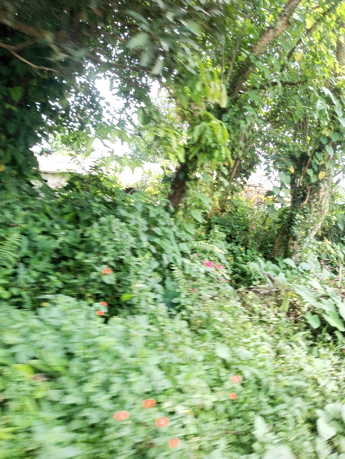The image displays a dense, verdant natural environment in the city of Namthoung, Laos. The scene is dominated by a lush expanse of green foliage, consisting of large trees with heavy canopies and a thick undergrowth of various smaller plants and shrubs. Several small, round, orange-red flowers are scattered prominently in the lower-middle and lower-left sections of the frame, with some pink flowers visible further right in the mid-ground. Through gaps in the vegetation, a light-colored structure, potentially a building wall or roof, is partially visible in the upper-left quadrant. To the right of the center, an indistinct yellow or light-brown object, possibly a vehicle or another structure, is partially obscured by trees and leaves. The entire image exhibits significant motion blur, suggesting it was captured while the camera or subject was in motion. Sunlight filters through the overhead leaves, indicating daytime. No individuals, animals, or explicit actions are discernible.