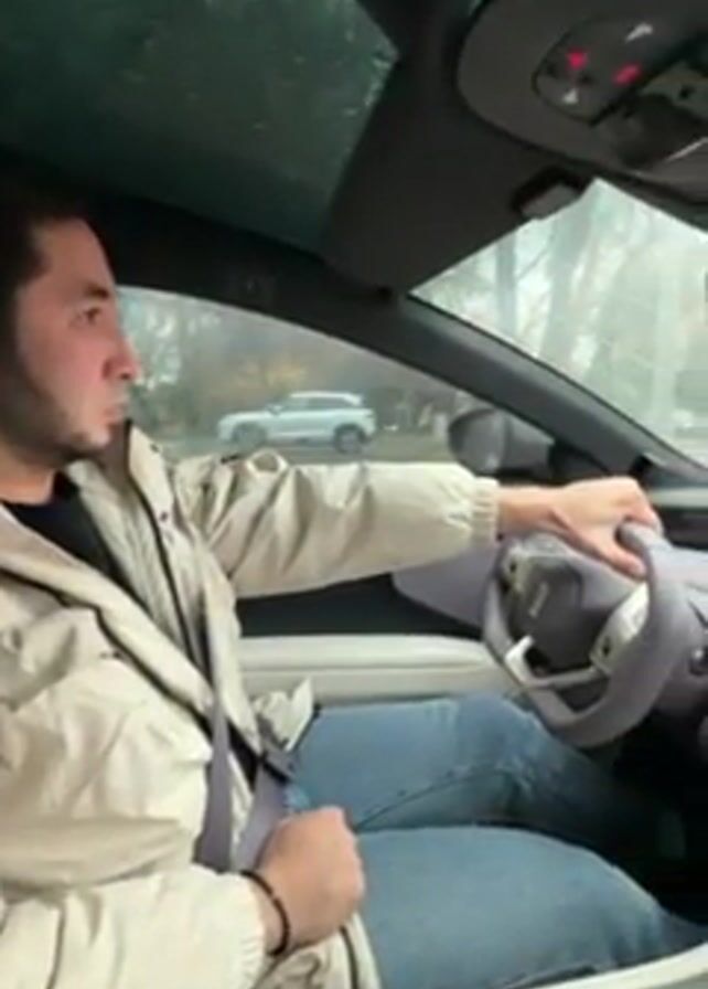 The interior of a car is shown from the driver’s point of view. A man is shown sitting in the driver's seat and steering the vehicle. The dashboard features a large touchscreen display. Outside the car it is raining, and other cars are visible. A can of Sprite is in the cupholder.