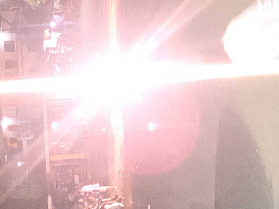 A bright light dominates the image, possibly sunlight, casting a strong glare and obscuring details. Visible structures include buildings and scaffolding-like construction. The intense light makes it difficult to discern specific objects, colors, or materials accurately, resulting in a blurry and overexposed picture.