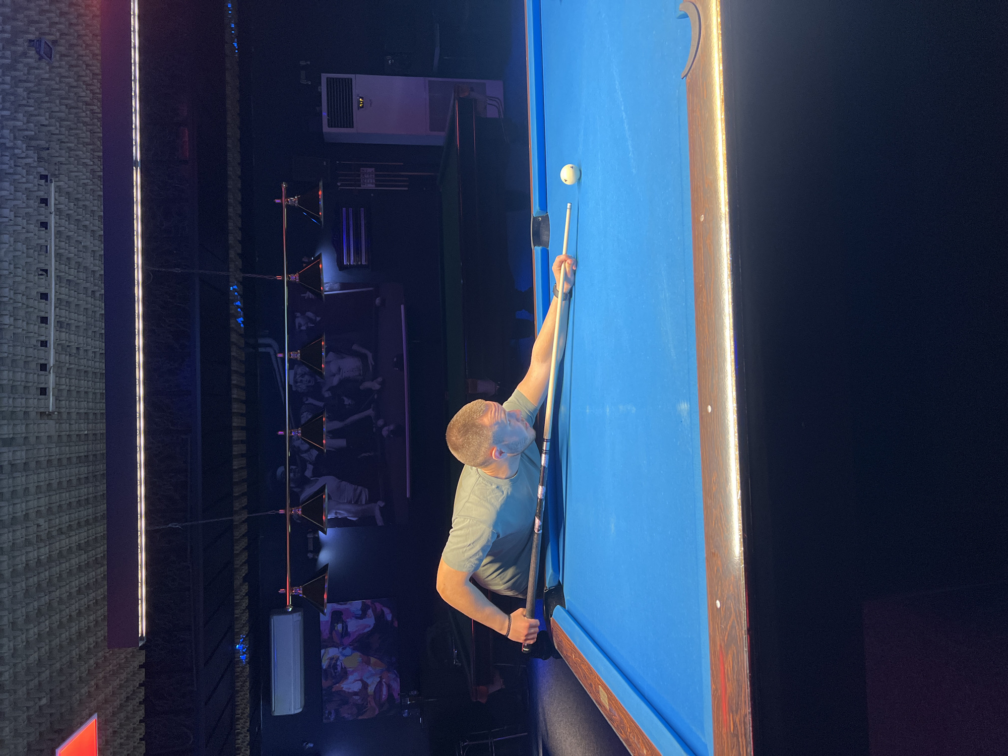An adult male is observed leaning over a blue felt pool table, aiming a cue stick at a white cue ball in a dimly lit billiards club located in Yambol, Bulgaria. The man, with short hair and wearing a light grey t-shirt, is positioned with his right hand gripping the cue's butt and his left hand forming a bridge on the table's surface. A dark bracelet is visible on his left wrist, and a light-colored band is on his right. The pool table features dark wood rails with light inlay dots. In the background, a second, dark green felt pool table is partially visible. The room's ceiling is covered with textured acoustic panels. Overhead, a black light fixture with four cone-shaped lamps illuminates the table. Other overhead strip lighting and a red illuminated rectangle are present. The dark walls display two large artistic posters: one with colorful, abstract faces, and another with a group of figures. Two white, vertical air conditioning units and a wall-mounted cue rack are also visible against the dark walls.