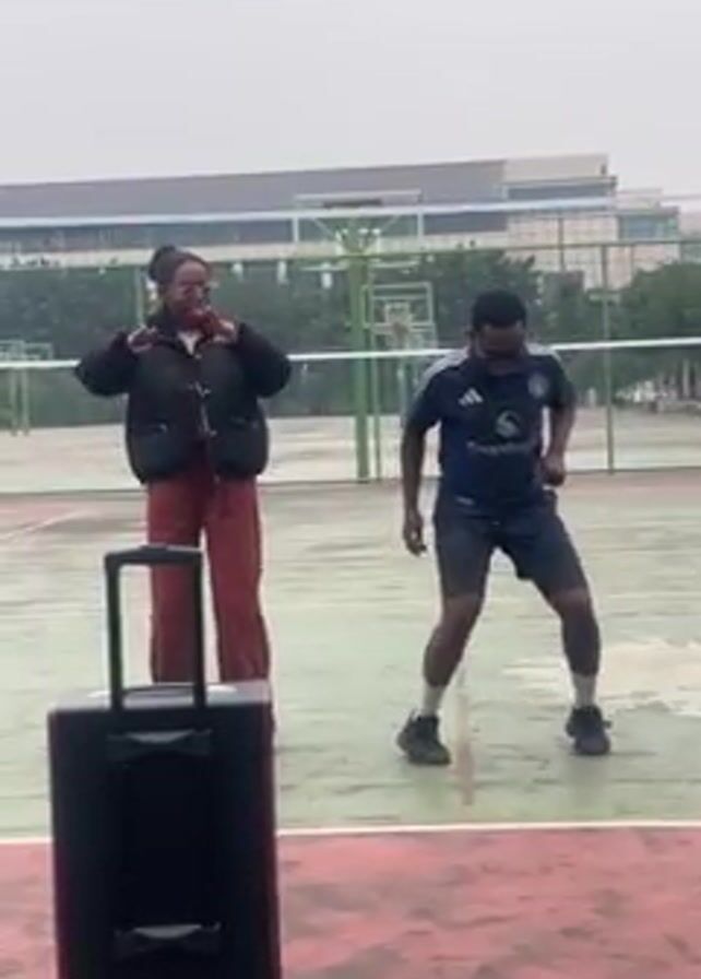A woman and a man are dancing on an outdoor tennis court. The woman is wearing a black puffer jacket, a tan top, and maroon pants. The man is wearing a dark blue soccer jersey and dark blue shorts. Both are wearing dark sneakers. They are both facing the camera and dancing in place. There is a black suitcase with a retractable handle and four wheels on the left side of the frame. Behind them is a building and a basketball hoop. The tennis court is green with red lines. The sky is overcast.