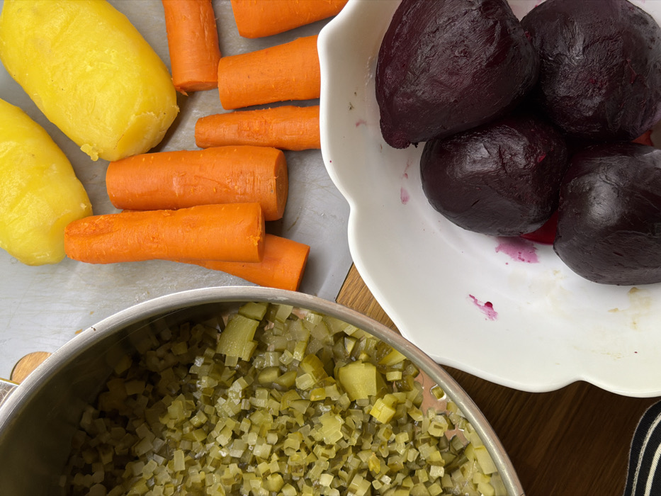 The image displays ingredients for a salad. Cooked yellow potatoes and cylindrical carrots lie on a gray surface. A white scalloped bowl contains several dark purple beets. A stainless steel pot is filled with finely diced light green and yellow ingredients, likely pickled cucumbers and potatoes. The ingredients are arranged on a wooden table, suggesting preparation for a meal.