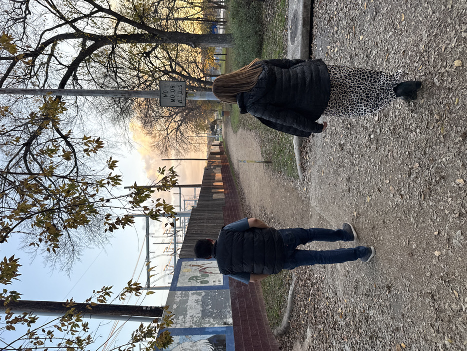 A man and a woman walk along a gravel path. The man wears jeans, a blue shirt, and a dark vest. The woman has long hair and wears a black jacket and a leopard print skirt. Bare trees are visible in the background against a pale sky. A sign reads "No motor vehicles" in English and Spanish. A red brick wall and a dilapidated utility structure line the path.