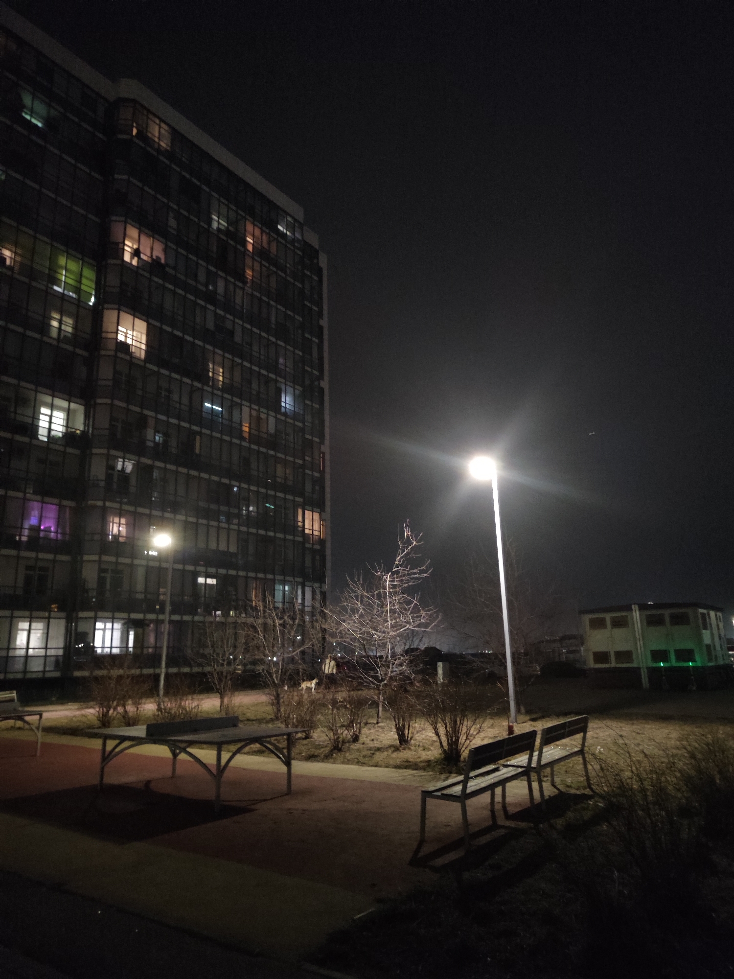 The image depicts an outdoor scene at night in an urban area. On the left, a tall residential building with multiple illuminated windows dominates the frame. In the foreground, there's a ping-pong table on a paved area. To the right of the table, a row of small, bare trees and bushes lines the area. Further right, there's a park bench with two seats. A bright streetlight illuminates the scene, casting long shadows. In the background, a low building with green lighting is visible. The sky is dark and overcast.