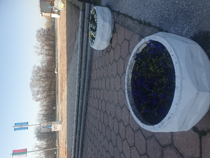 The image presents an outdoor scene at the Regatta Venue (Rowing Canal) in Plovdiv, Bulgaria, under clear daylight conditions. In the foreground, hexagonal red-brown paver stones lead to a set of grey rectangular stone steps. Two white, faceted concrete planters are positioned on the paver path; the closer planter contains dark purple flowers and green foliage, while the farther one holds white and yellow flowers with green foliage. Beyond the steps, a wide, open area, possibly paved or a dirt expanse, extends towards a body of water. On the left side of this open area, two flagpoles display flags: the Bulgarian national flag (white, green, red horizontal stripes) and a blue and white flag (light blue with a darker blue element). Adjacent to the flagpoles, a white rectangular plinth, possibly a monument or marker, features a clear enclosure containing a blue object. To the far right, a small, light-colored wooden kiosk or building is situated near the water's edge, with a coiled yellow object visible next to it. The background reveals a long, narrow body of water, indicative of the Rowing Canal, bordered by a dense line of bare deciduous trees extending across the horizon. The sky is clear and light blue, devoid of clouds. No individuals are present in the depicted scene.