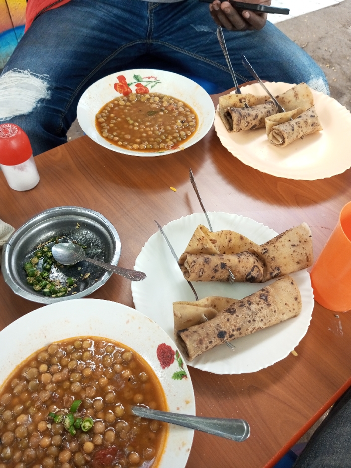- "A table displays two plates of chickpea stew, two plates of chapati rolls secured with skewers, and a small bowl of sliced green chilies with a spoon" by FM-XIT4O2, licensed under CC BY 4.0