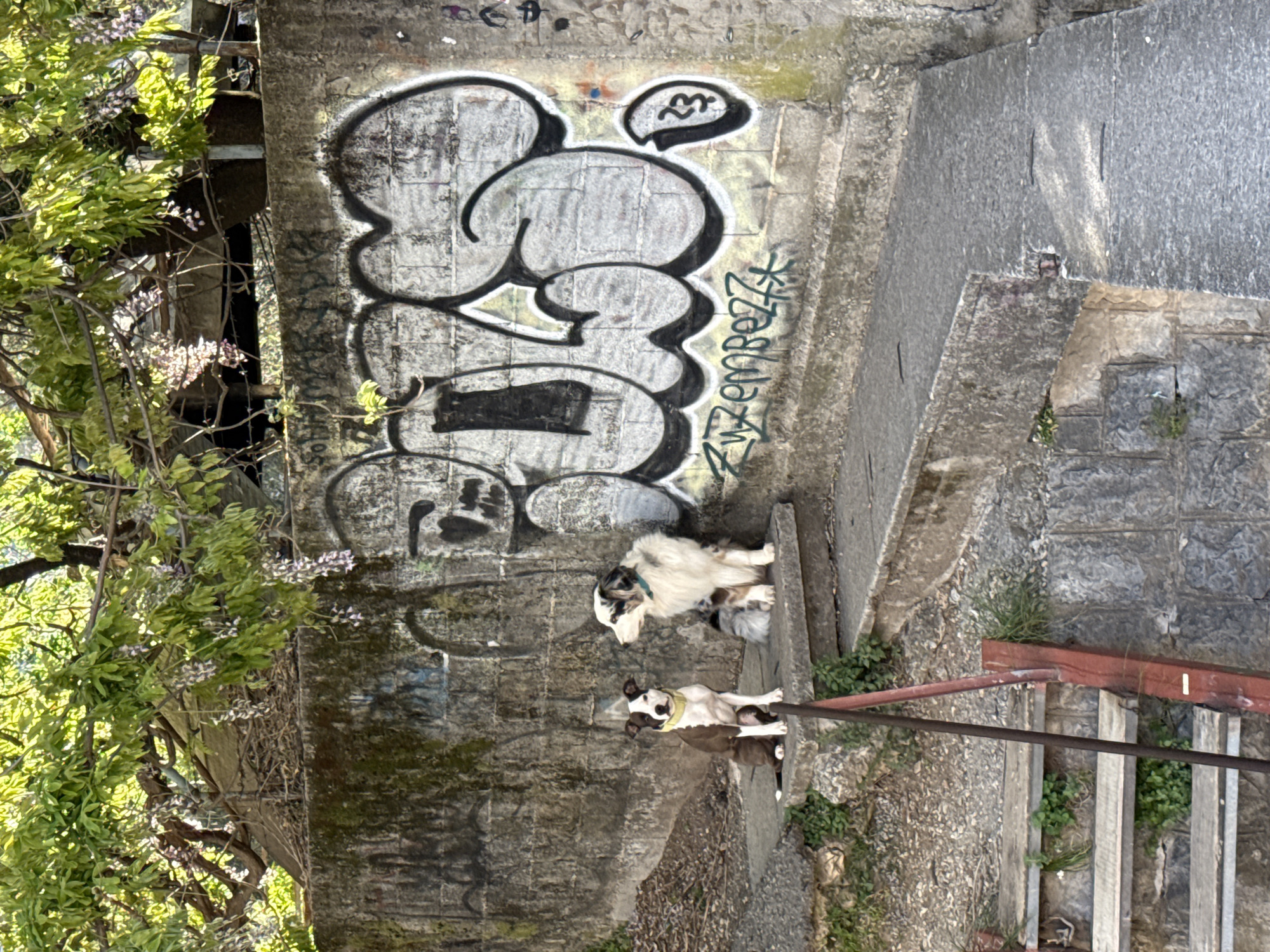 Two dogs stand on a concrete structure adjacent to stairs with graffiti in Budva, Montenegro. The upper dog is merle, the lower is brown and white. Leashes are visible. Vegetation is on the left. The scene includes concrete structures with graffiti, stairs, dogs, and vegetation. The location is Budva, Montenegro.