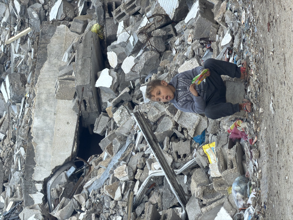 - "In Gaza City, Palestinian Territory, a young boy, approximately 5-7 years old, is seated on a concrete block amidst an extensive field of building rubble" by FM-PSI0J3, licensed under CC BY 4.0