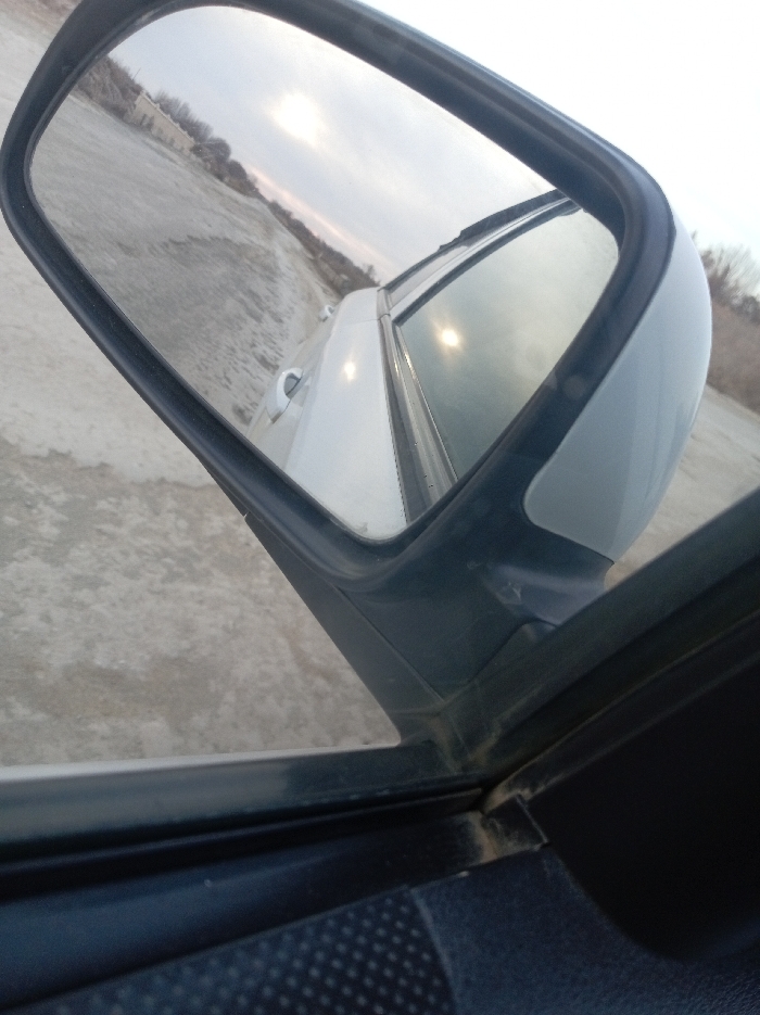 - "The image depicts a close-up view from the interior of a vehicle, specifically focusing on the passenger-side exterior mirror and a portion of the vehicle's dark-colored door panel and window frame" by FM-oyrGI2, licensed under CC BY 4.0