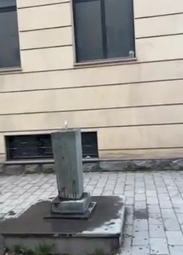 water fountain in front of a building. The fountain is made of stone and has a small stream of water flowing from the top. The building is light brown with windows. The ground is paved with gray square tiles. The area around the fountain is wet. There's a glass on a window sill.