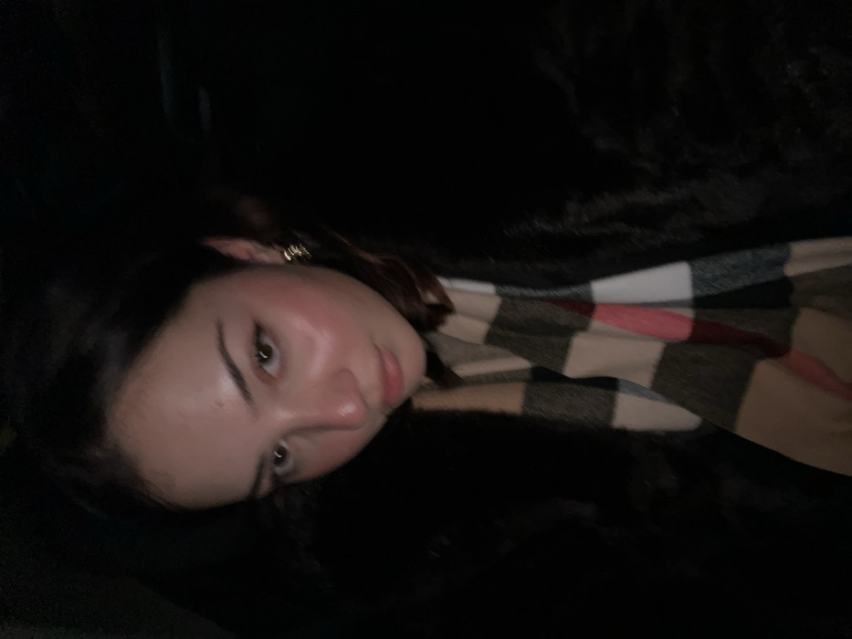A young woman lies on a dark surface, her head tilted to the side. Her skin has a dewy glow. She has brown hair and wears a beige and black plaid scarf with hints of white and pink. The background is mostly dark, with some undefined texture that seems like fur. The lighting highlights the woman's face and the pattern of the scarf.