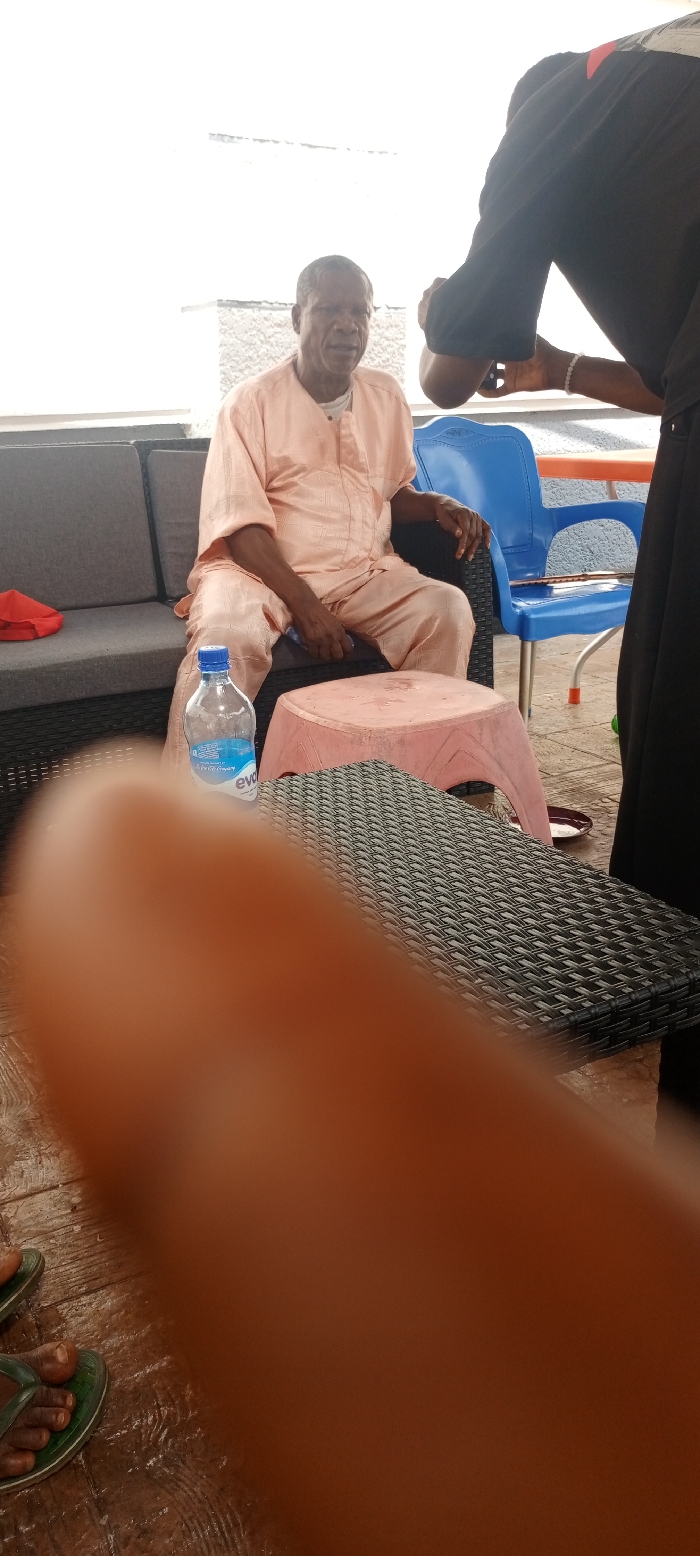The image depicts an outdoor or semi-outdoor scene in Unknown, Unknown. An elderly man with dark skin, wearing a light peach traditional tunic and matching trousers, is seated on a dark grey wicker sofa with light grey cushions. He looks directly towards the camera with a neutral expression. A red cloth is positioned on the sofa to his left. To the right of the seated man, a second individual is partially visible from the torso up, wearing a black shirt and a white beaded bracelet on their right wrist. This individual is holding a small dark object with both hands, positioned in front of them. A large, blurred orange-brown finger obscures the lower foreground. On a dark grey wicker rectangular table in front of the seated man, a partially full clear plastic bottle of "Evo" brand water with a blue cap is present. A small, pink plastic stool is located between the table and the seated man. Behind the seated man, a blue plastic outdoor chair and a portion of an orange table are visible. The floor is dark brown, exhibiting a wet or textured appearance. The background is a bright, undifferentiated white, suggesting either an open sky or a light-colored wall.