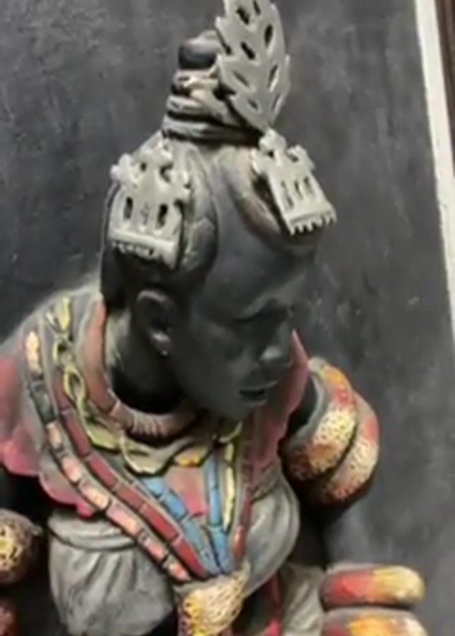 A close-up video shows a framed artwork depicting a sculpted figure. The figure is dark gray with some pink, red, yellow, and blue details. It is adorned with ornate headwear, including a fan-like piece and structured elements resembling miniature buildings. The figure also wears multiple strands of jewelry around the neck and upper arms. The background of the artwork is a dark gray texture. The camera slowly pans down the artwork.