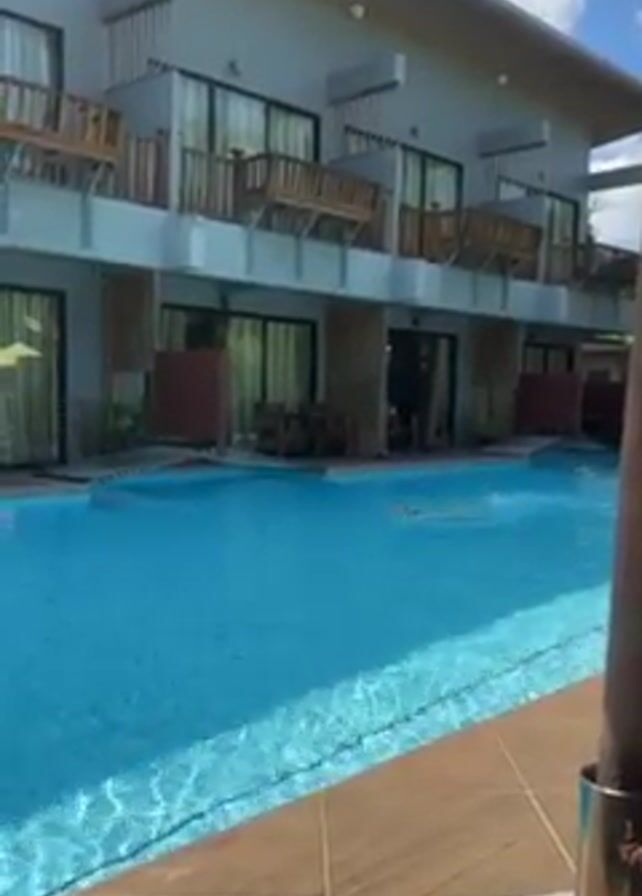 rectangular swimming pool in front of a two-story building. The pool has light blue water and is surrounded by brown tiles. A person is swimming freestyle in the pool. The building is gray with balconies on the second floor, each featuring wooden railings and benches. The ground floor rooms have glass sliding doors leading directly to the pool area, with small bridges providing access to the water. The sky is blue with scattered white clouds. A silver can is visible in the bottom right corner of the frame.