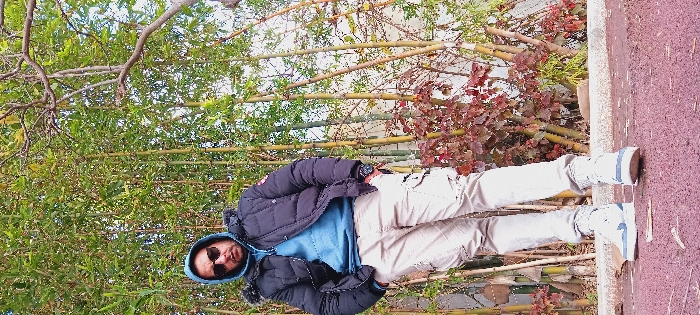 A single male subject is depicted standing outdoors in Rabat, Morocco. The individual is positioned frontally, looking towards the viewer, with his hands in the pockets of his pants. He wears dark sunglasses, a light blue hooded sweatshirt with the hood up, and a dark blue or black puffer jacket. A dark-faced watch is present on his left wrist. He wears white sneakers with blue accents. The background features a dense growth of tall, green bamboo stalks, with additional plants exhibiting reddish foliage to the lower right. The subject stands on a reddish-brown, textured ground surface, which is separated from the background foliage by a light-colored horizontal curb. Bare tree branches are partially visible against a light sky above the bamboo.