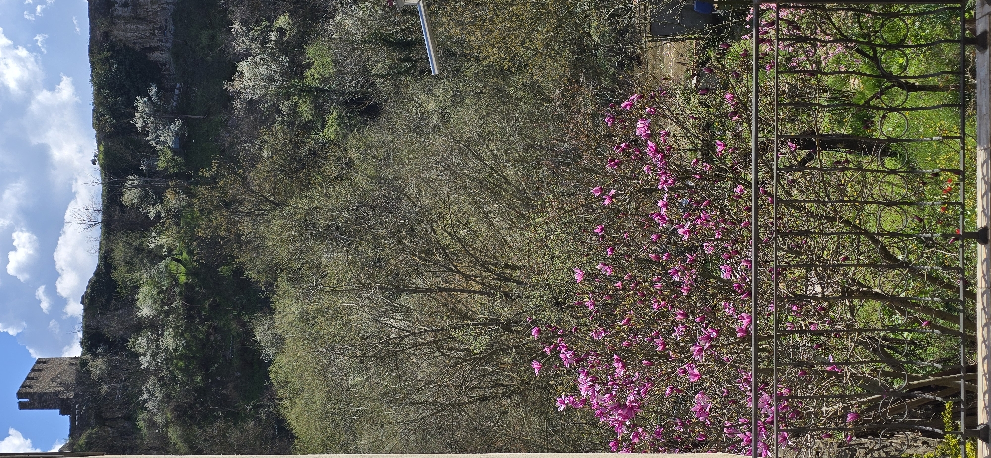 The image captures a view in Veliko Tarnovo, Bulgaria, looking towards the city's historical landscape from behind an ornate iron railing. A fortress with a crenellated tower is visible against a backdrop of a partly cloudy sky. Below the fortress, the hillside is covered with a mix of trees and vegetation. A magnolia tree, covered with pink blossoms, stands prominently in the foreground. The image is rotated 90 degrees counterclockwise.