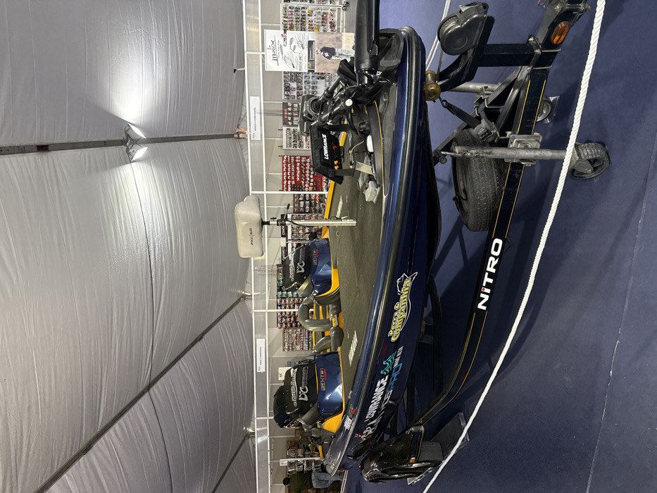 The image depicts an indoor exhibition space, identified as a fishing event in Mora, Portugal, held within a large white event tent illuminated by overhead industrial lights. The central subject is a dark blue and yellow Nitro bass boat prominently displayed on a black dual-axle Nitro trailer. The boat is equipped with multiple fishing seats, including an elevated pedestal seat, a trolling motor at the bow, and Lowrance brand electronic navigation/fish-finding equipment at the helm. Decals on the boat's hull include "YAMAHA," "LOWRANCE," "SIMRANCE," "DC," "CHAMPIONSHIP," and "PESCA & COMPANHIA." The trailer features a horizontally mounted spare tire. A white rope barrier delineates the boat's display area on the blue carpeted floor. In the background, several retail display racks are visible, stocked with a variety of fishing lures, tackle, and accessories. Signage in the background includes "PESCA E COMPANHIA," "molix," and "MEGLEAN." A single individual, partially obscured, stands among the background displays on the far left. No direct actions or interactions are occurring.