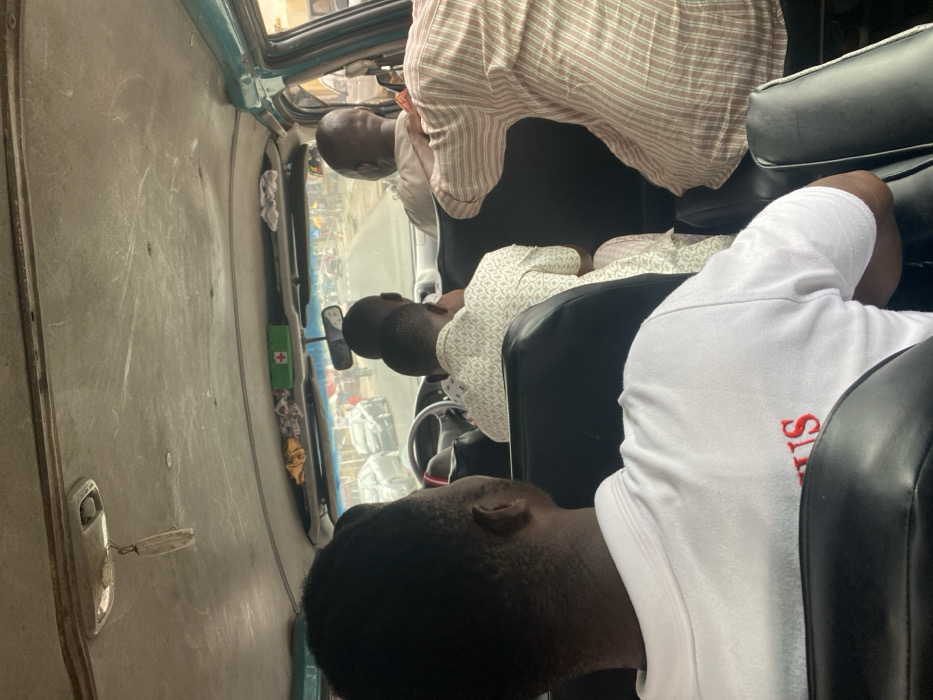 The image provides an interior view of a vehicle, likely a passenger van or 'tro-tro', looking forward through the windshield onto a street in Accra, Ghana