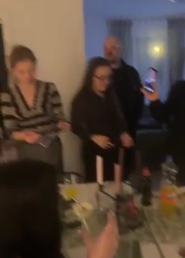 n indoor gathering of approximately 8-10 people. Some are standing around a table laden with food and drinks, including a Fanta bottle. There are decorative candles and holiday themed decorations on the table. People are dressed in both casual and semi-formal attire. At least one person is recording with their phone. The video shows multiple rooms, including one with a bar. There is a mirror reflecting the gathering. The video appears to be shaky and the focus shifts often.