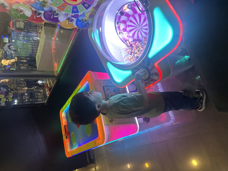 A young boy stands in an arcade, focused on a ticket redemption game. The game features a spinning wheel and prizes visible inside a transparent dome. The game is illuminated with vibrant neon lights. Next to the ticket game is a air hockey table. The boy has dark hair and is wearing a light-colored shirt and jeans with sneakers. The arcade environment reflects in the glass surfaces nearby.
