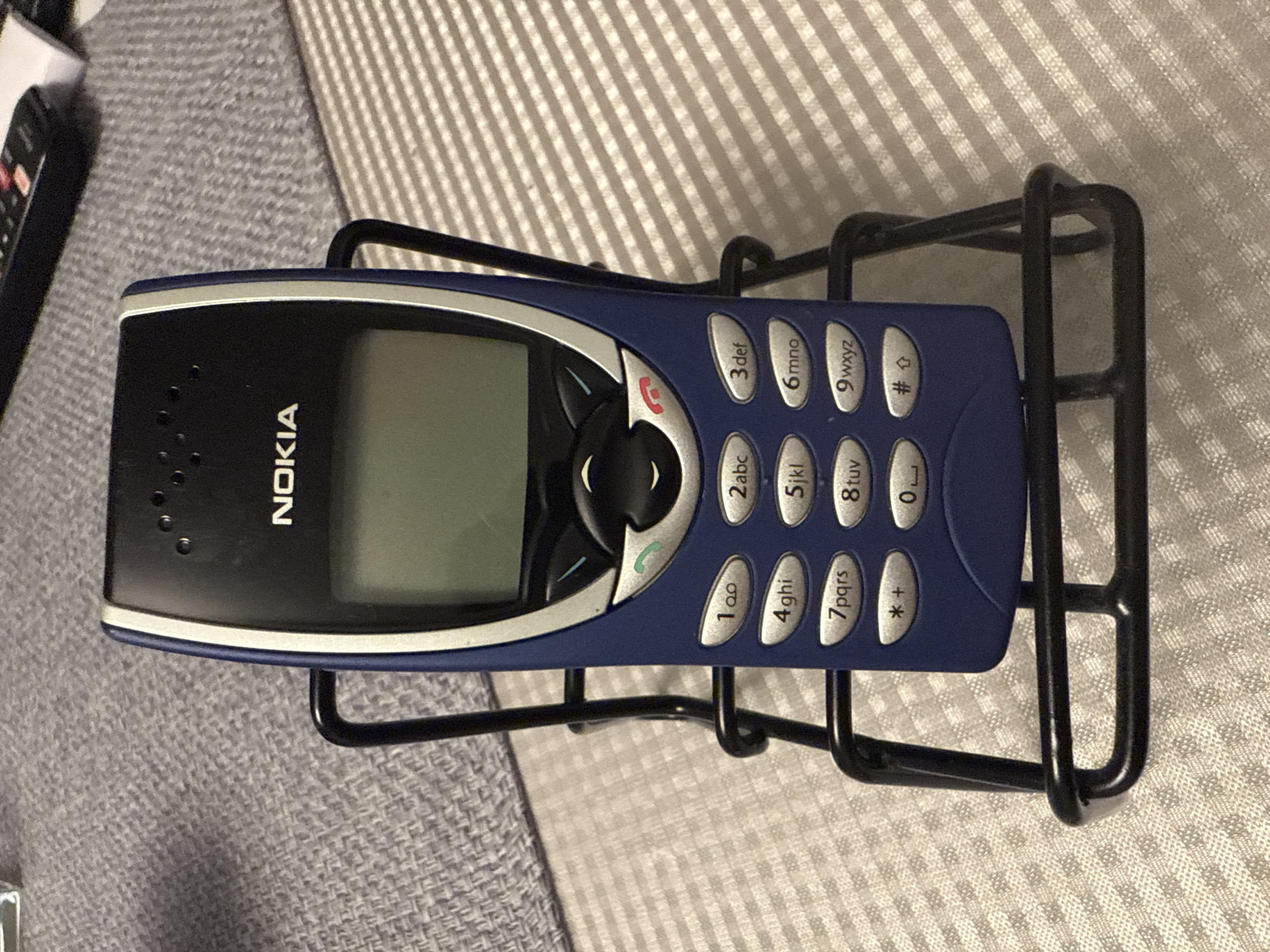 A blue Nokia 3310 mobile phone is presented in a black wire rack on a surface with a textured pattern in shades of gray and white. The phone’s screen is blank. The brand name "NOKIA" is visible on the left side of the phone, and the numeric keypad is displayed on the right. A section of a dark-colored object, potentially another electronic device, is visible in the upper left corner of the frame. There is no indication of the location being Munich, Germany.