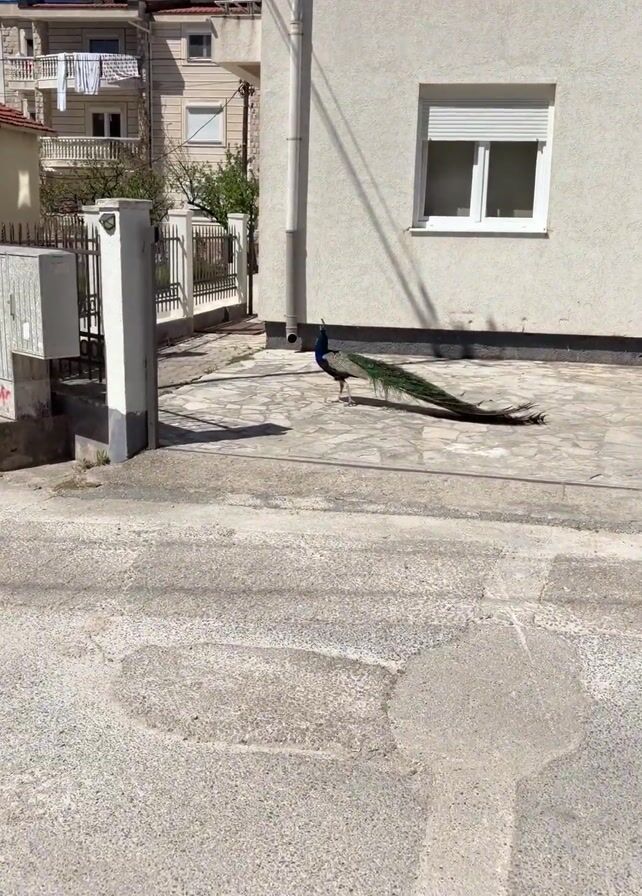 peacock standing on a stone courtyard. The bird has a dark blue head, a speckled green body, and a very long feathered tail. The bird is surrounded by a white building with a closed white window, a metal gate, and a second building in the distance. The ground is a light gray stone, and the scene is brightly lit with natural sunlight.
