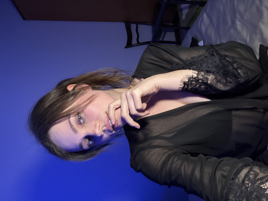 A single young adult female is depicted indoors, in what is understood to be a location in Fiuggi, Italy. She has light skin, brown hair, and light-colored eyes. She is wearing a black sheer robe with visible lace trim on the sleeves, under which a black bra is visible. Her left hand is positioned with the fingers resting near her lower lip. The scene is illuminated by a prominent blue light source from the left, casting a blue hue on the left side of her face and the adjacent wall. In the background to the right, a dark wooden chair with a slatted back is partially visible. The female appears to be seated or reclining on a bed covered with a light-colored sheet, which occupies the lower foreground of the image.