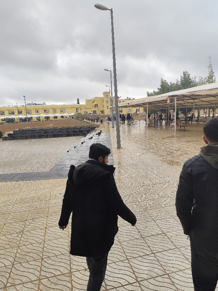 The image depicts an outdoor environment in Jibb as-Safa, Syria, under an overcast sky. The ground in the foreground is a light-colored paved pathway with a wavy, patterned texture, exhibiting wet areas consistent with recent precipitation. Two individuals are prominent in the immediate foreground, observed from behind as they walk away from the camera. The person on the left wears a black long coat and dark trousers; their dark hair and beard are visible as their head is slightly turned. The person on the far right is partially visible, wearing a dark jacket over a dark hooded garment. Extending into the mid-ground is a broad paved walkway. Parallel to this walkway, multiple grey streetlights with overhead fixtures are erected. To the left of the main pathway, a dark-colored, multi-tiered structure resembling stepped seating or planters is visible. Further along the pathway, a small, dark-colored dog is observed walking. To the right of the walkway, a large, open-sided structure with a white fabric canopy roof and white support poles covers a paved area furnished with tables and chairs, under which several individuals are sitting and standing. In the mid-ground and background, a distinctive yellow multi-story building with numerous windows dominates the horizon. A dark statue or monument stands on the ground in front of this building. Additional yellow buildings are partially visible to the right. Multiple individuals are distributed across the paved areas and pathways, engaged in walking, standing, and congregating near the buildings and under the covered structure. Green trees are visible behind the covered structure and in the distant background.