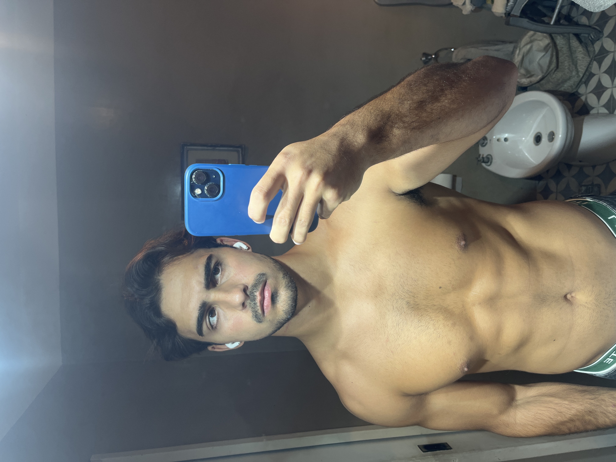 A male individual is depicted in a mirror selfie, shirtless, revealing a muscular torso and a partial view of green-banded underwear