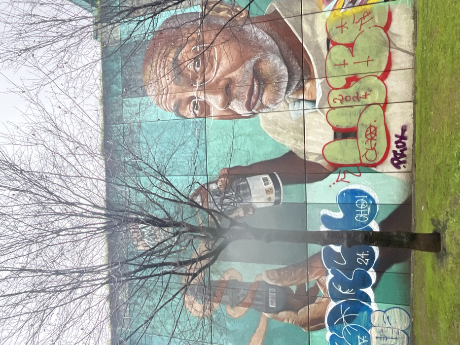 A mural on a concrete wall depicts a bespectacled man with a grey beard, wearing a light-colored shirt. He holds what appears to be a spray paint can. Green and blue graffiti adorn the mural's side. A bare tree stands in front of the mural. Grass is seen on the right of the mural. The mural is made up of tiles.