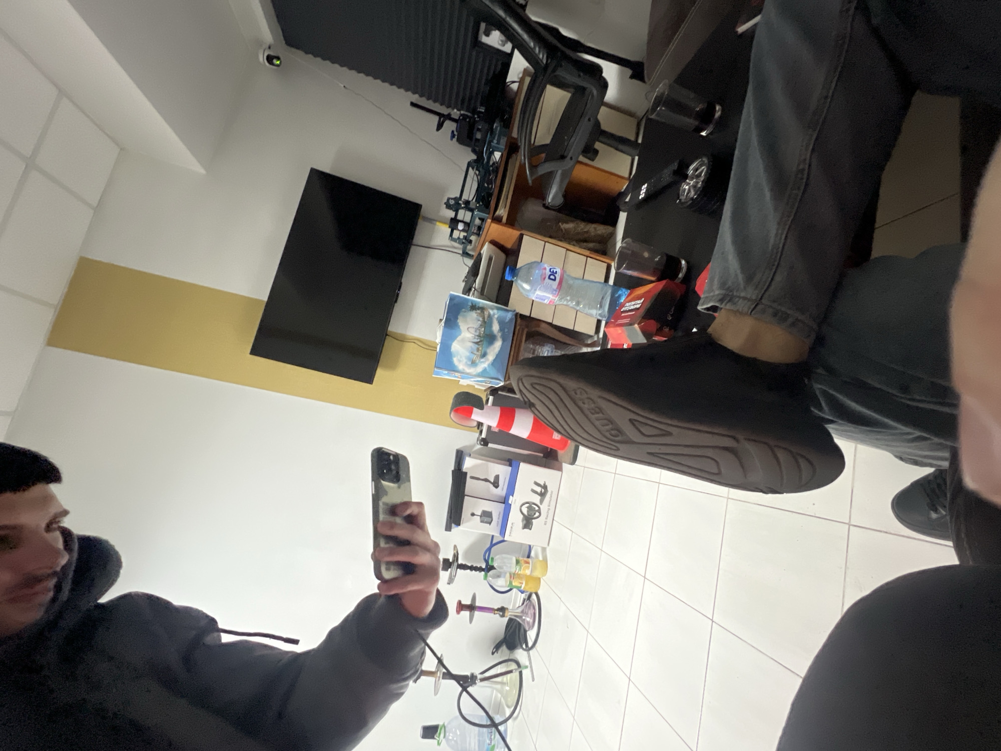 person taking a selfie in a room. The room appears to be an office or studio space, featuring a television mounted on the wall, office furniture including a chair and desk, and various items on the floor such as hookah equipment, bottled water, and product boxes. The location is likely in Sofia, Bulgaria, based on the prompt. The person in the image is holding a smartphone up to take a picture. Another person is seated nearby. The environment is well-lit with white walls.