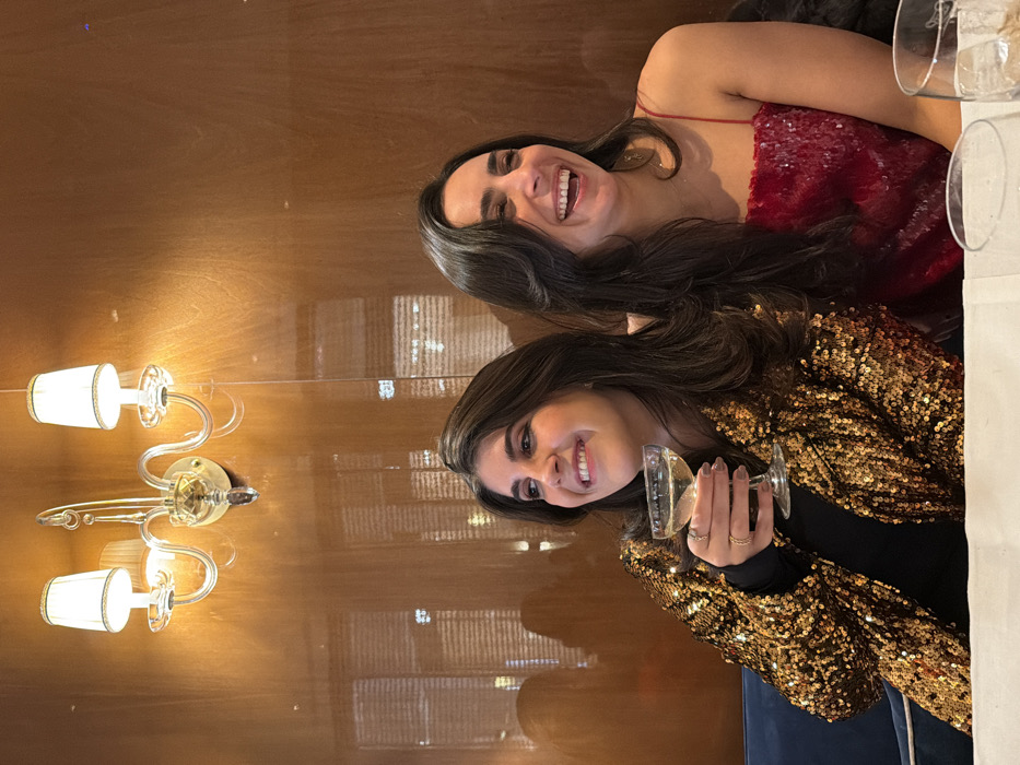 Two smiling women pose together in front of a reflective, wood-paneled wall. The lower woman wears a sparkling gold jacket and holds a champagne coupe. The woman above her is wearing a red sequined dress. A decorative wall sconce with multiple lights is visible on the left side of the frame. A white tablecloth and wine glasses are partially visible on the right.