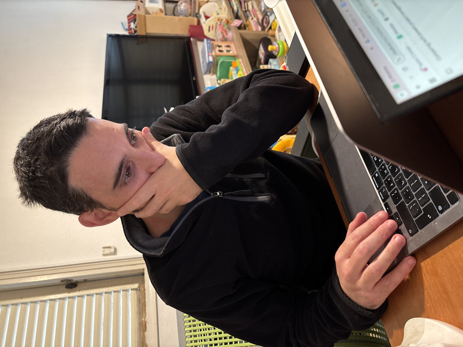 A male individual is depicted in an indoor residential setting in Tel Aviv, Israel. He is seated at a wooden table, wearing a black fleece quarter-zip pullover. His left hand covers his mouth and chin, with fingers resting on his cheek, while his gaze is directed downwards at the screen of a silver laptop positioned in front of him. The laptop features a QWERTY keyboard with integrated Hebrew characters. His right hand rests near the laptop's trackpad or keyboard. A second laptop screen is partially visible in the immediate foreground, angled towards the viewer, displaying multiple web browser tabs. In the background, a window with white blinds is visible to the left. To the right, a large, dark flat-screen television is mounted or placed on a shelf, with a cluttered shelving unit beneath it containing various objects, including children's toys. The environment suggests a combined living and workspace.
