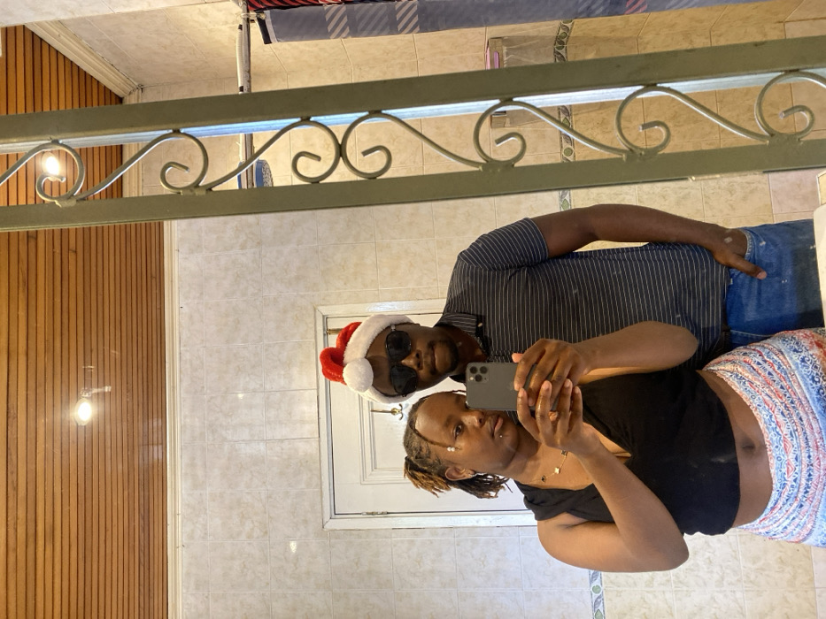 A mirror selfie captures an adult female and an adult male indoors. The female, positioned in the foreground and slightly to the left, holds a dark-colored smartphone with a triple camera array to take the picture. She wears a black sleeveless top, a multi-patterned skirt in shades of blue, white, and orange, a nose stud, a lip ring on her lower left lip, and a necklace with small, dark, butterfly-shaped charms. Her hair is styled in dreadlocks or braids. The male stands behind her, slightly to the right, wearing a red and white Santa hat, dark sunglasses, a grey and white striped short-sleeved polo shirt, and blue jeans, with his left hand in his pocket. The background features light-colored square tiled walls, a wooden slat ceiling with a recessed light fixture, and a white door with a handle. A decorative, vertical, wrought-iron-like metal element frames the right side of the mirror. Reflected in the mirror to the far right, a patterned fabric, possibly a shower curtain or hanging textiles, and a metal rail are discernible. The specific location within Nairobi, Kenya, cannot be determined from the visual information presented in the image.
