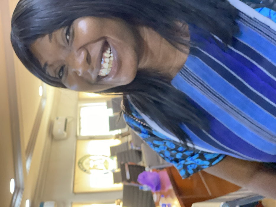 A woman smiles broadly at the camera, her teeth prominently displayed. She wears a blue striped shirt with a floral pattern on the sleeve. Dark hair frames her face. The background is a room with light beige walls, several chairs, and a window with sunlight streaming in. An air conditioning unit is visible on the wall. The scene appears to be indoors, potentially in a meeting room or office setting.
