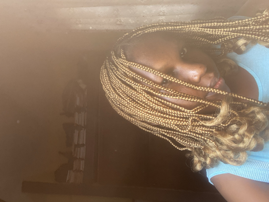 A female subject with a dark complexion is depicted in a close-up indoor portrait taken in Nsukka, Nigeria. Her hair is styled in numerous light brown (honey blonde) box braids, with several strands, particularly on the left side, featuring curled ends. These braids partially obscure the right side of her face, including her right eye. She is wearing a light blue garment with a visible mesh or textured pattern on the left shoulder area. Her gaze is directed towards the camera, with a neutral expression. The background is dark, revealing a wooden shelf or cabinet unit against a wall, populated with multiple distinct stacks of books or files. A strong light source from the right creates significant glare and localized overexposure in the upper right quadrant of the image.