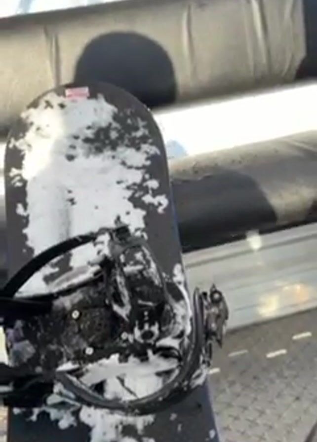 close-up of a snowboard covered in snow, sitting on a chairlift