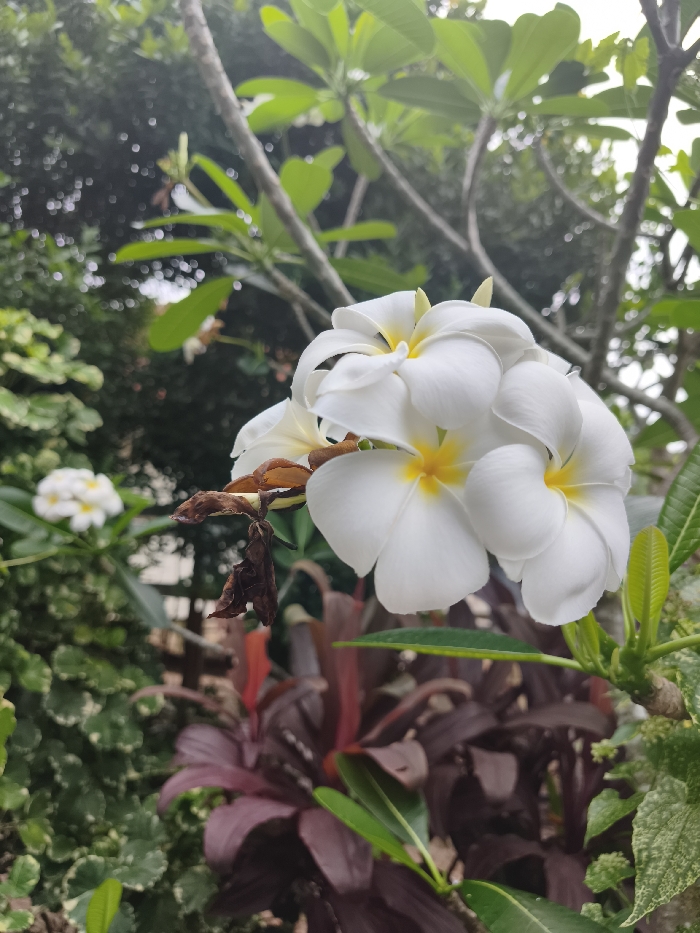 A cluster of white plumeria blossoms with yellow centers dominates the view, set against a backdrop of green leaves and tree branches. A few withered, brown leaves cling nearby. In the blurred background, other greenery and a single white blossom add depth to the scene. The lower portion reveals reddish-purple foliage intermingling with green plants.