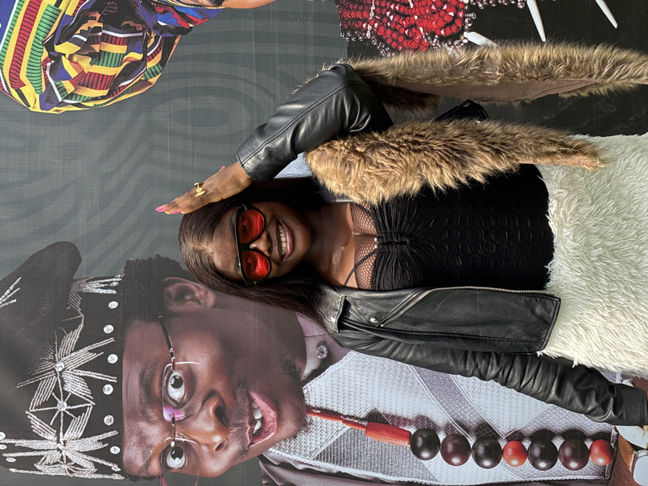 A young woman is centrally positioned, smiling broadly, against a large promotional banner in Itirin, Nigeria. She wears oversized red-tinted sunglasses with black frames, a black leather moto jacket, a black ruched or mesh-style top, and a white faux fur mini-skirt. A brown faux fur stole is draped over her left shoulder and arm. Her right hand is raised, fingers extended, near her temple, revealing long pink acrylic nails and a gold ring on her ring finger. The background banner displays two stylized images of individuals in traditional Nigerian attire. On the left, a man with glasses and a patterned Yoruba cap (fila) with silver embellishments exhibits a wide-eyed, open-mouthed expression, wearing a light-colored traditional garment with a prominent red and black beaded necklace. On the right, partially visible, is a woman's head adorned with a vibrant, multicolored geometric headwrap (gele). Faint text, including "ITIRIN," is discernible on the banner, confirming the location as the city of Itirin.