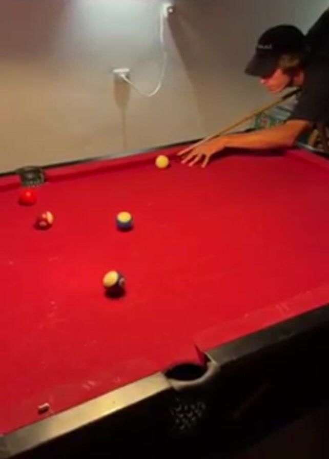 A young man wearing a baseball cap is lining up a shot on a red pool table. There are several pool balls on the table, including red, yellow, and blue striped balls. A lamp hangs over the pool table, and a fan is visible on the wall behind him. He is holding a pool cue and appears focused on the shot.