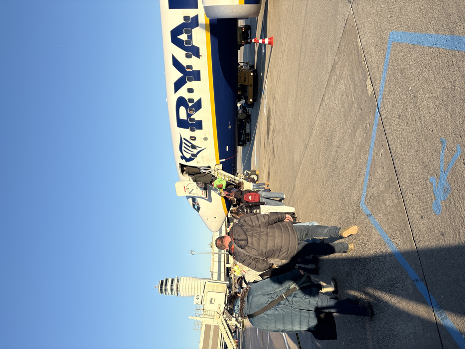 This image depicts an active aircraft boarding scene on an airport apron under a clear blue sky. The location is Vienna International Airport (VIE) in Schwechat, Austria, identifiable by the distinctive control tower prominently visible in the background to the left. In the foreground and midground, a queue of approximately ten to fifteen passengers is observed walking towards and ascending the integrated forward airstairs of a white, blue, and yellow Ryanair aircraft. The aircraft's fuselage prominently displays the "RYANAIR" logo and harp emblem. Passengers are dressed in various forms of winter outerwear, including dark jackets and coats, suggesting cool weather conditions. One individual on the airstairs is wearing a bright green garment, while another person in a yellow high-visibility vest is partially visible near a stationary jet bridge to the left. To the left of the aircraft, a silver-colored jet bridge, labeled "C40," is visible, but it is not connected to the Ryanair aircraft. The airport control tower, a multi-tiered white structure with a large observation deck, stands further in the background. Beneath the aircraft's right wing (viewer's left), a yellow ground support vehicle is positioned. An orange and white traffic cone is also visible on the tarmac to the right of the aircraft. The ground consists of a paved asphalt surface, typical of an airport apron. Blue painted lines, forming a rectangular outline with a stylized human figure, are visible on the tarmac in the foreground. Strong, elongated shadows cast by the people and objects indicate bright daylight with a low sun angle, possibly morning or late afternoon.