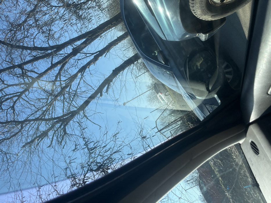 The image depicts an outdoor scene captured from the interior of a vehicle, looking through the front windshield towards the passenger side in Pleven, Bulgaria. The foreground shows a portion of a dark gray vehicle dashboard and a light gray A-pillar. Bright sunlight creates glare and reflections on the windshield. In the midground, a dark-colored (likely black or dark blue) sedan is parked, with its side mirror reflecting elements of the viewer's vehicle interior. To the right of the sedan, a partial view of a teal or dark green truck/SUV is visible, specifically its front right fender and a tire labeled "BFGoodrich." The background features a clear blue sky dominated by several bare deciduous trees, some bearing elongated, dark seed pods or catkins. Below the trees and behind the vehicles, a fence, possibly chain-link, is visible, bordering an area of dry vegetation or dirt. Further in the background, a light-colored (silver or white) SUV is parked on a slightly elevated area. No individuals are visible.
