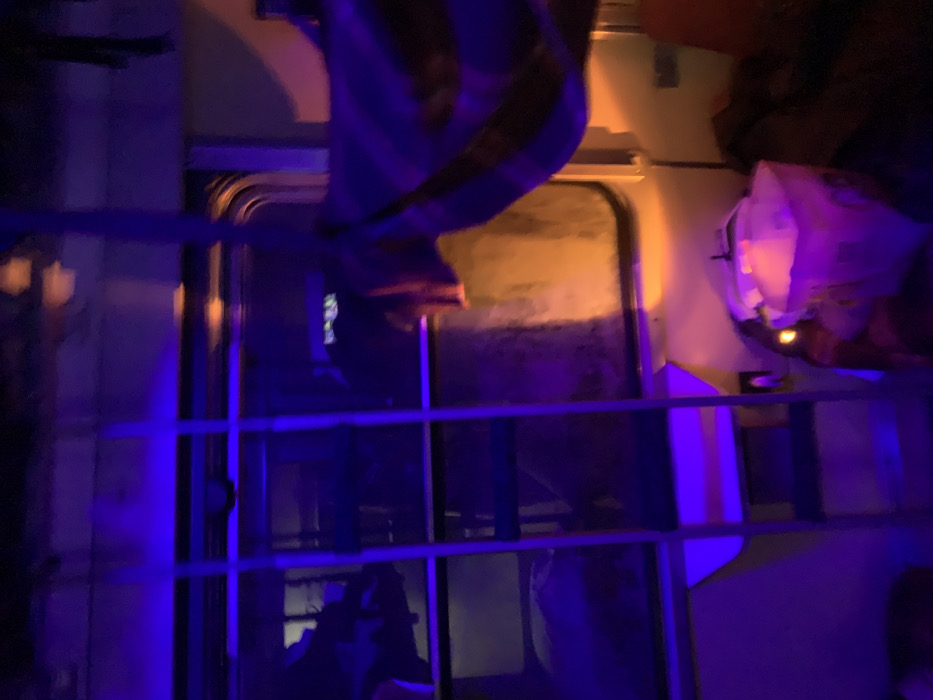 A blue-tinted, upside-down view shows a partially obscured interior through a barred window